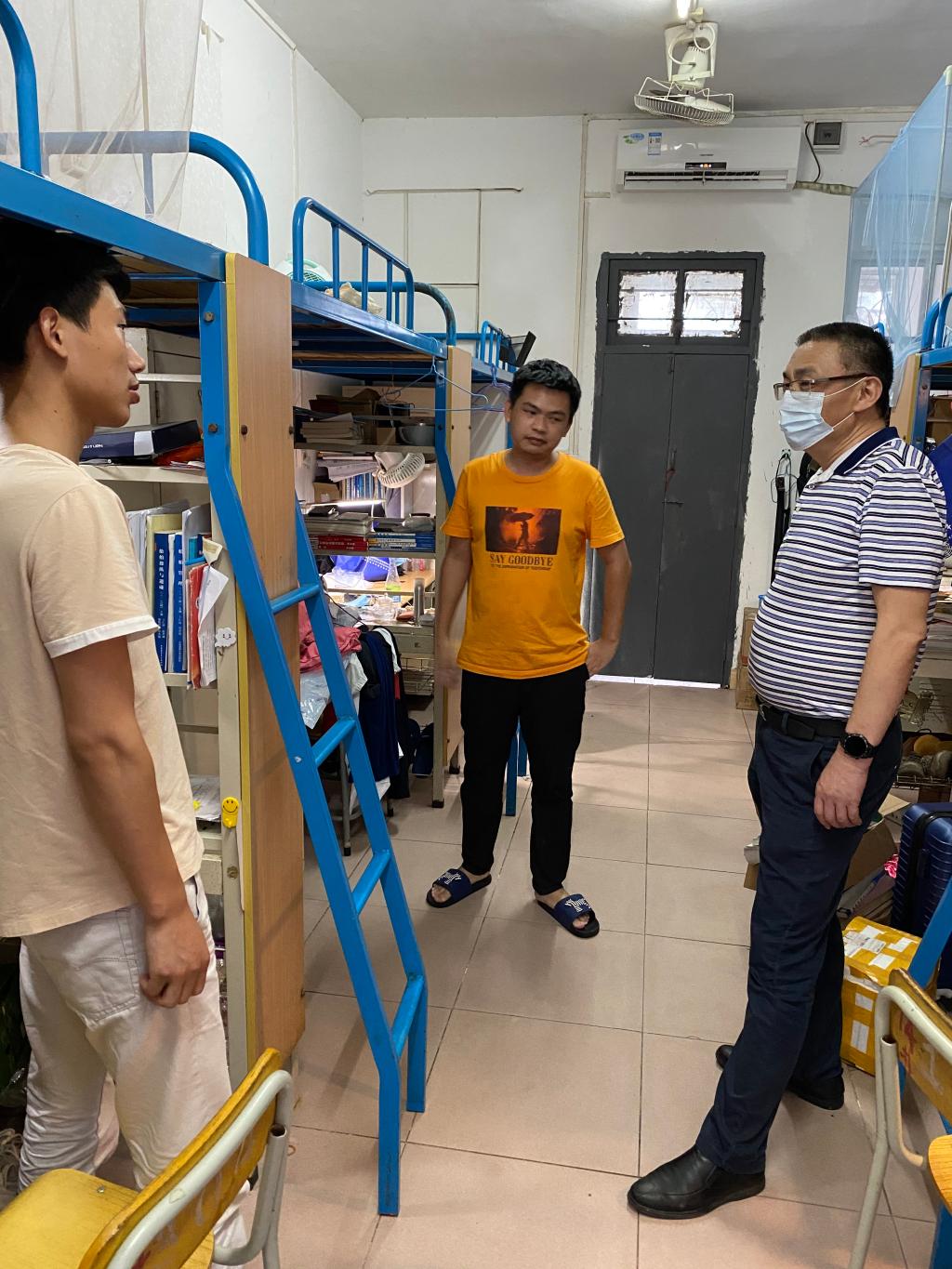 在宿舍大院,张懿认真查看了宿舍的消毒卫生情况,并逐一询问同学们返校乘车情况,详细了解同学们考证通过情况、就业签约情况等。他要求大家注意个人卫生、注意保持宿舍通风,严格遵守校纪校规;勉励大家树立信心,好好复习,积极配合老师参加培训,争取全部通过水手工艺及适任证书考试;最后,张懿书记预祝大家毕业顺利,前程似锦。
