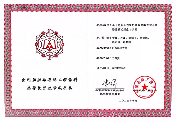 2023年10月,教育部海洋工程类专业教学指导委员会和中国造船工程学会联合公布了2023年度全国船舶与海洋工程学科高等公司产品成果奖评审结果。公司w66旗舰厅申报的“基于创新工作室的地方船海专业人才培养模式探索与实践”(完成人:黄技、严谨、袁剑平、李荣辉、陈志明、赵炳雄)喜获教学成果二等奖。
