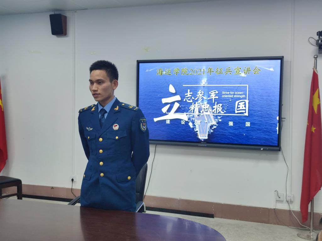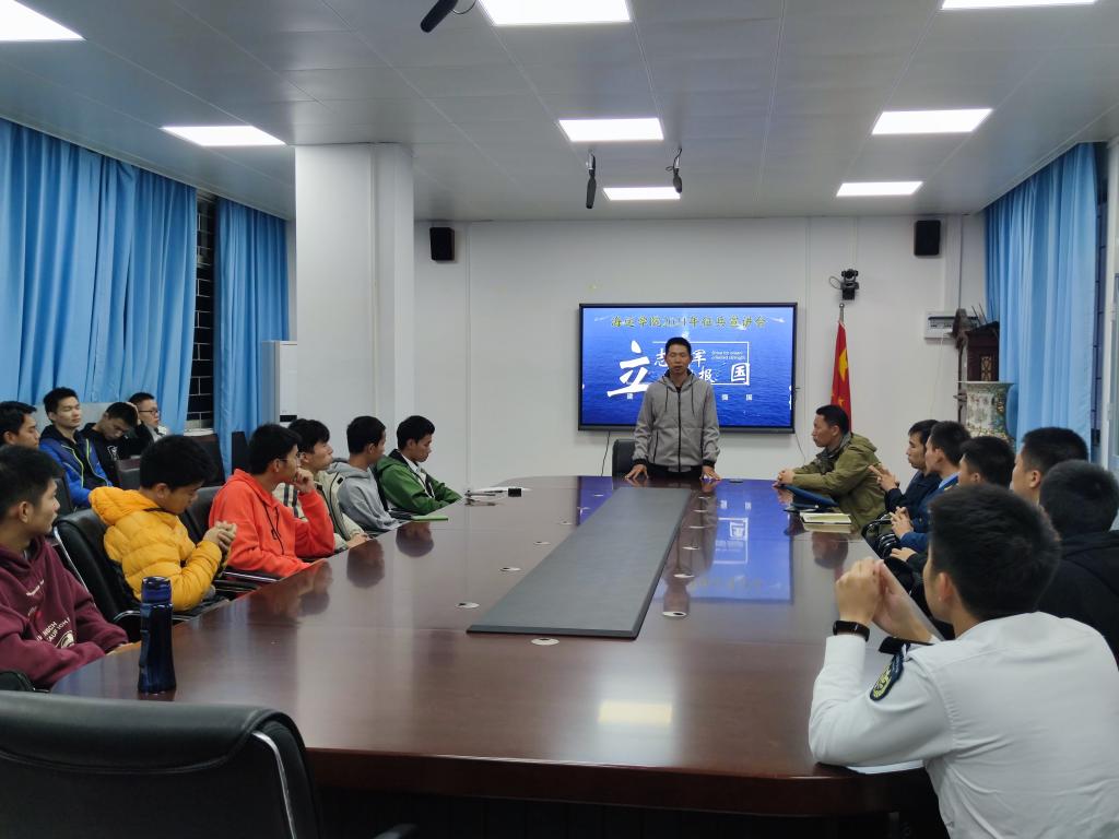 会议首先观看2021年各军兵种征兵宣传视频。江涛详细介绍了2021年“一年两征”的新政策变化,根据近年来公司参军入伍的实际情况认真帮大家分析问题,对军、地、校各项优惠政策进行了详细的讲解,并且鼓励同学们敢于挑战、敢于磨炼,为国防建设做出自己的贡献。同学们热情高涨,积极提问,纷纷发表自己的参军志向。此次会议还邀请了今年退伍复学的2019级轮机工程许健、梁嘉成两位同学来分享他们的军旅生涯:老员工作为未来的国家栋梁,应做到刻苦学习掌握知识本领,树立坚定的理想信念和人生目标;更应该把参军入伍、保家卫国作为青春的历练和责任。