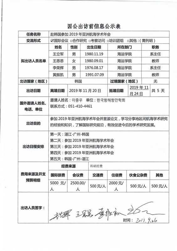根据《关于进一步规范省部级以下国家工作人员因公临时出国的意见》的要求,现将公司因公出访信息(王立军等4人)予以公示。公示时间为2019年9月26日至10月8日。如有异议,请在公示期内,向相关单位反映。(海运公司:0759-2383007;国际交流与合作处电话:0759-2396206;纪委办电话:0759-2383501)
