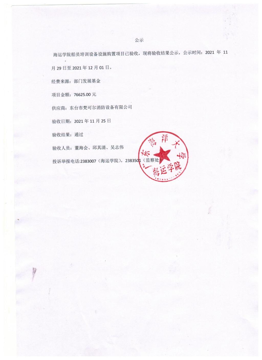 关于船员培训设备设施购置项目的验收公示