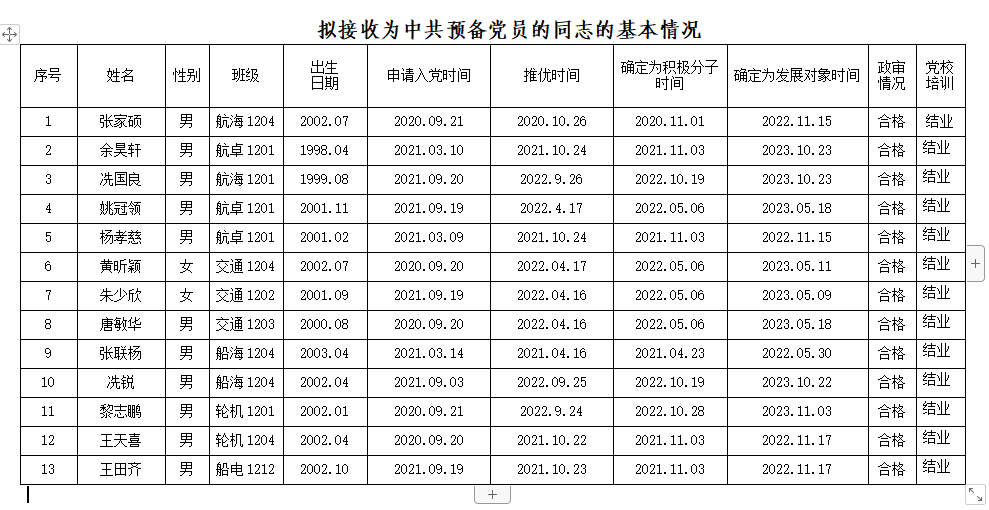 根据《w66发展党员工作实施细则》规定,经本人提出申请,党组织培养考察,支委会审查研究决定,经公司党委预审通过,拟接收冼国良等13名同志为中共预备党员。现将有关情况予以公示,征求党员、群众意见。