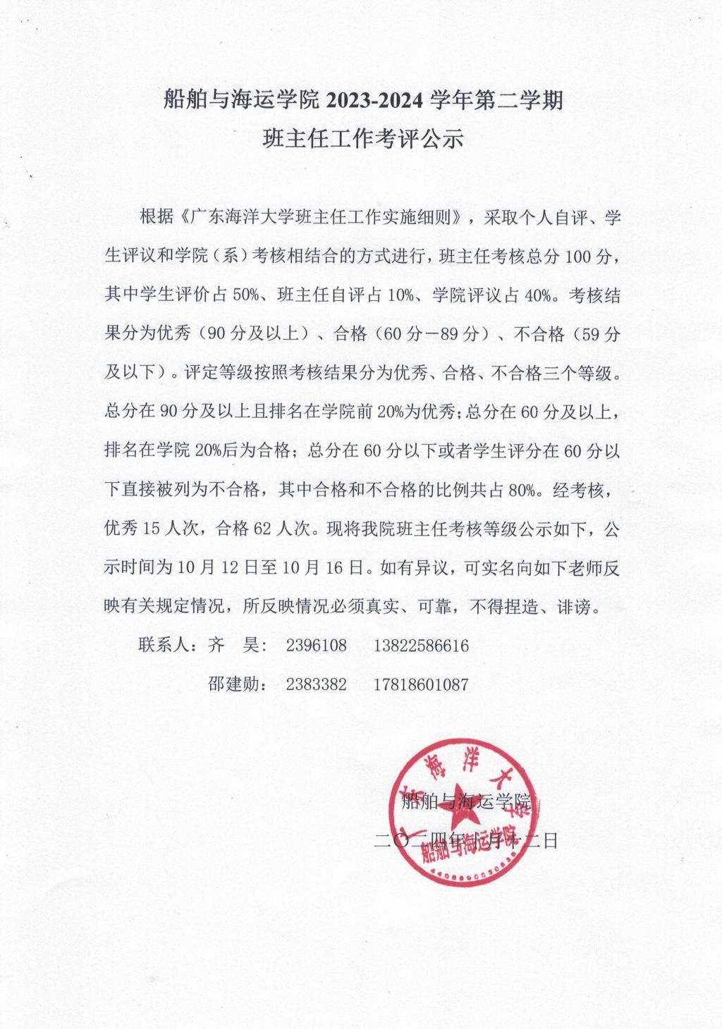 根据《w66班主任工作实施细则》,采取个人自评、员工评议和公司(系)考核相结合的方式进行,班主任考核总分100分,其中员工评价占50%、班主任自评占10%、公司评议占40%。考核结果分为优秀(90分及以上)、合格(60分-89分)、不合格(59分及以下)。评定等级按照考核结果分为优秀、合格、不合格三个等级。总分在90分及以上且排名在公司前20%为优秀;总分在60分及以上,排名在公司20%后为合格;总分在60分以下或者员工评分在60分以下直接被列为不合格,其中合格和不合格的比例共占80%。经考核,优秀15人次,合格62人次。现将公司班主任考核等级公示如下,公示时间为10月12日至10月16日。如有异议,可实名向如下老师反映有关规定情况,所反映情况必须真实、可靠,不得捏造、诽谤。