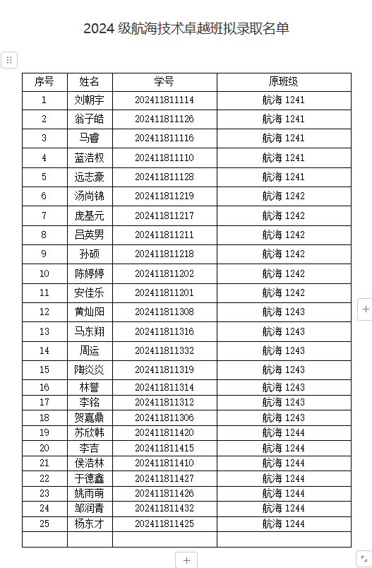 在选拔过程中,坚持“公开、公平、公正”及“员工自愿、控制规模、择优遴选”的原则,确保信息公开、流程规范和生源选拔质量。重点考察了平均绩点、班级排名、是否挂科、英语考试成绩和专业发展潜质等方面,最终确定刘朝宇等25位同学入选“2024级航海技术卓越班”。如有任何疑问请联系航海技术专业负责人:王立军。