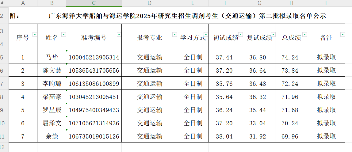 根据公司及公司研究生招生工作的相关文件精神和要求,经公司研究生招生录取工作领导小组审定,将公司2025年硕士研究生招生调剂(交通运输)第二批考生复试成绩及拟录取名单公示。如有拟录取考生自动放弃,按总成绩排名依次递进。