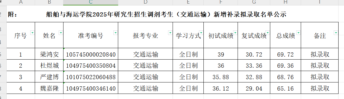 根据公司及研究生院统筹安排,现公布研究生招生调剂(交通运输)新增补录拟录取名单。
