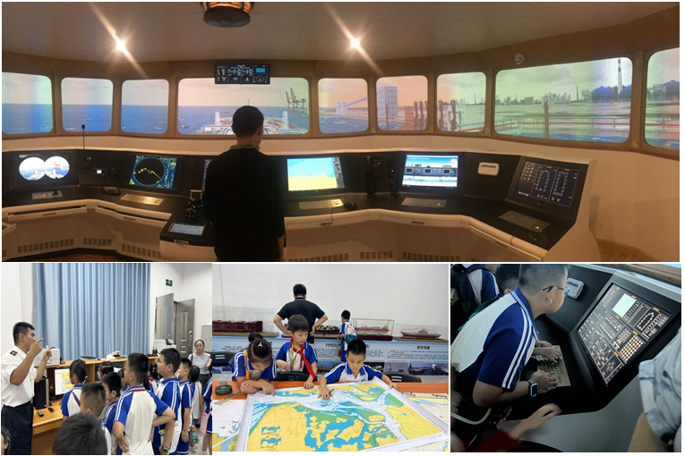在航海科技与文化科普教育基地室内,志愿者带领同学们体验了全任务式航海大型操纵模拟器,学习了现代航海雷达、电子海图、航线设计、灯号等相关科普知识,同学们兴致勃勃。
